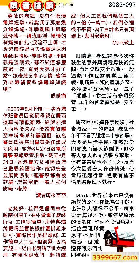 3.老總好,我們幾個同事從越南迴國了。在中資電子廠裝line,工作很簡單,用特製螺絲把精益管按設計圖拼起來即可,實際操作是扭螺絲,工作簡單人工低,但很累,因為要趕工。近日老閶請了個女經理,有時也跟我們一起扭螺絲,但人工是我們幾個工人的三倍(一萬二),我們心裡很不平衡,為了生計也只有頂硬上,鬼叫我窮啊!====Mark敬上