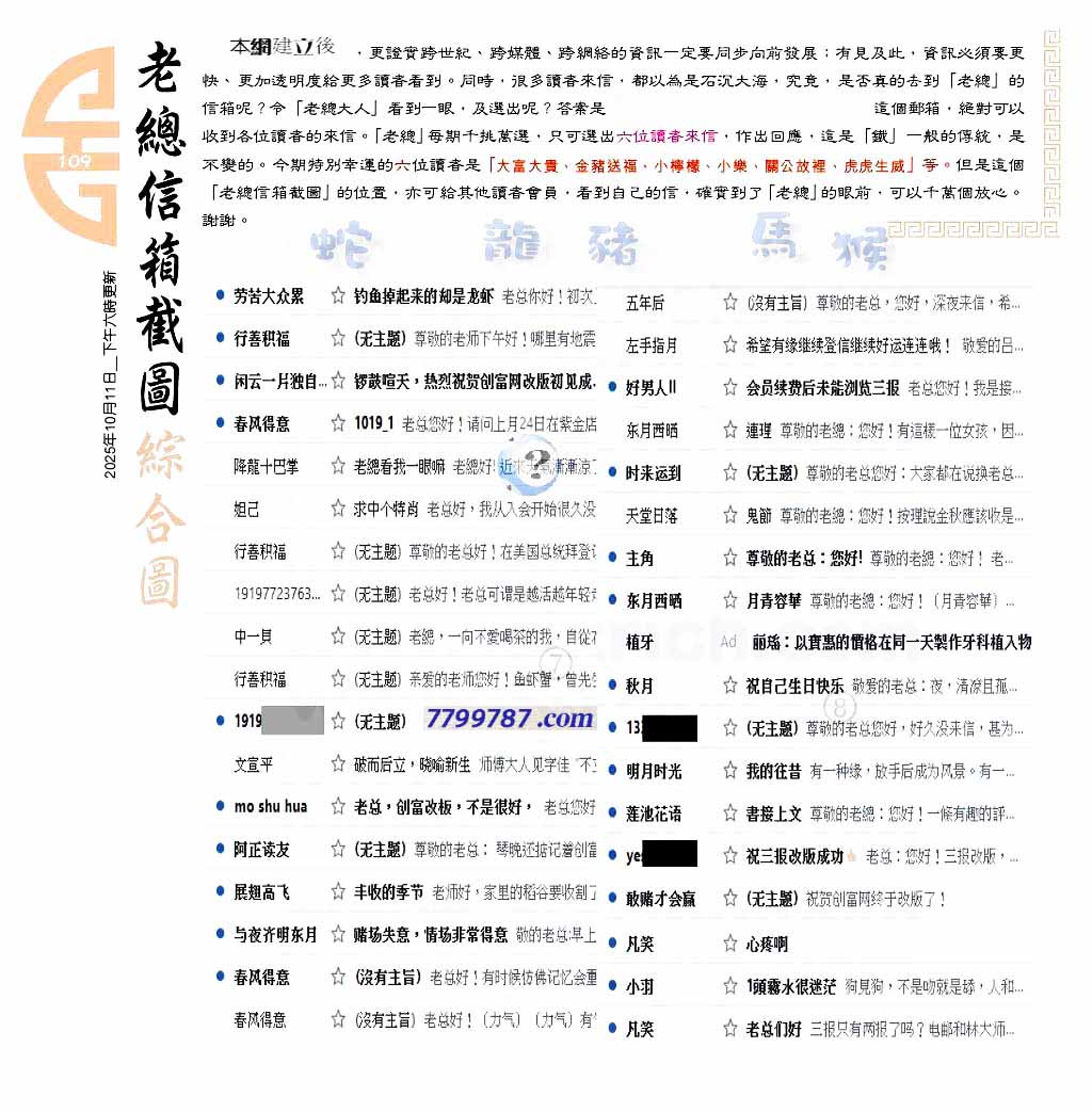 主题 :109期:六合皇金句/老总论码/萧公子/林大师/五行夺码/老总信箱截 |