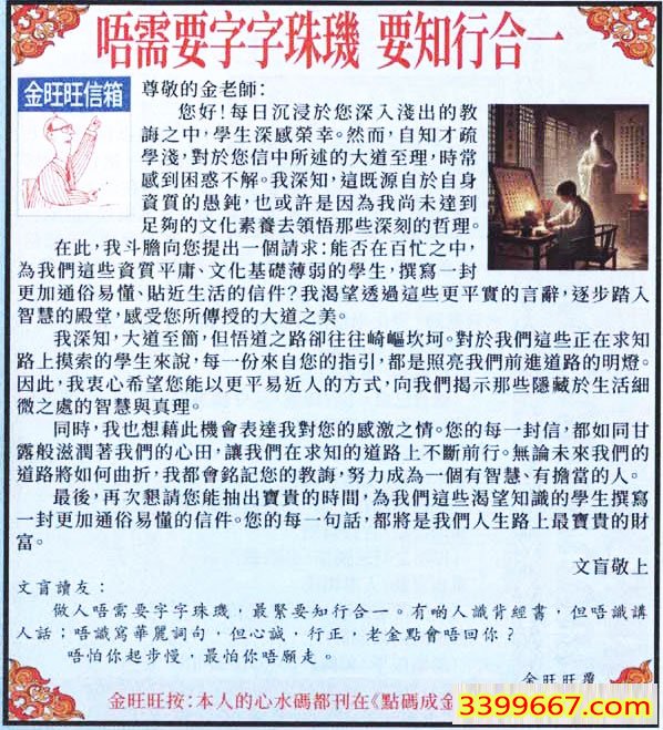 | 主题 :012期:金旺旺信箱彩民推荐→→《唔需要字字珠璣 要知行合一》 |