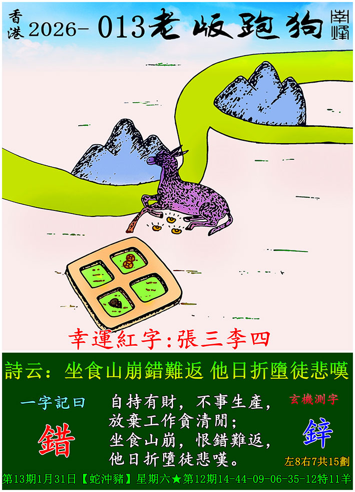 主题 :013期老版跑狗一字記之曰:【錯】 玄機測字:《鋅》