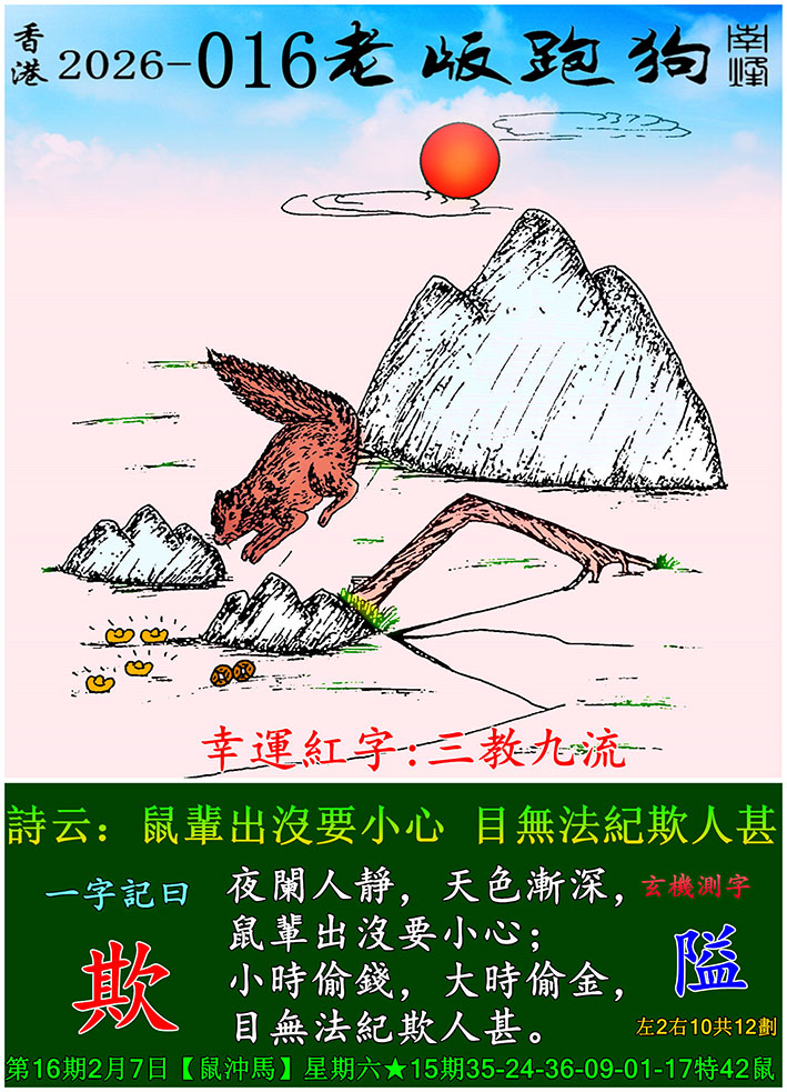 | 主题 :016期老版跑狗一字記之曰:【欺】 玄機測字:《隘》 |