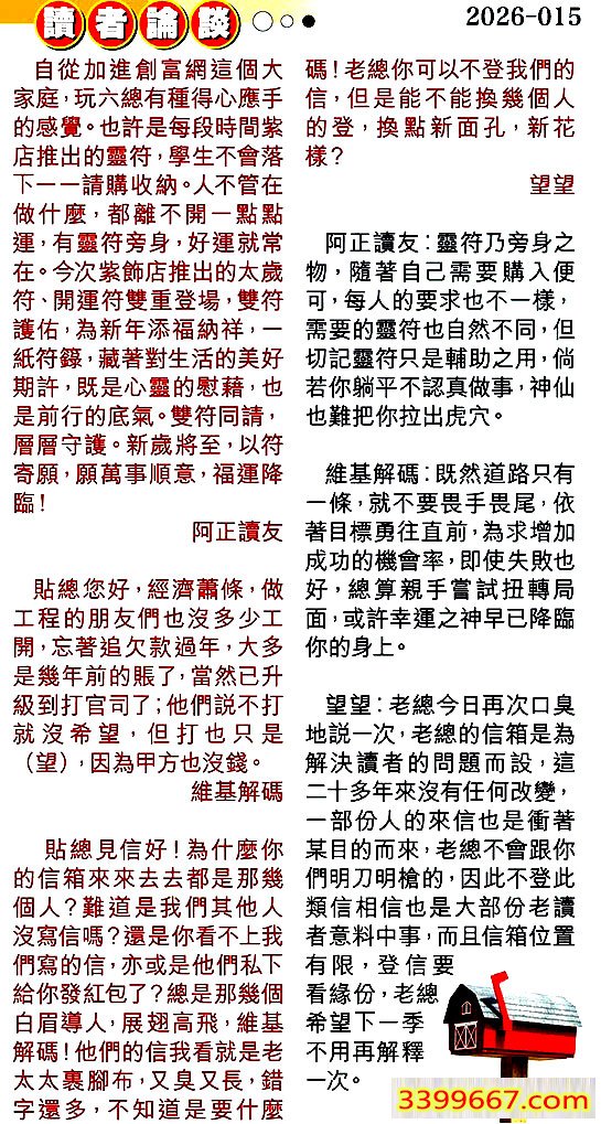 015期:彩民推荐〖貼信讀者論壇〗